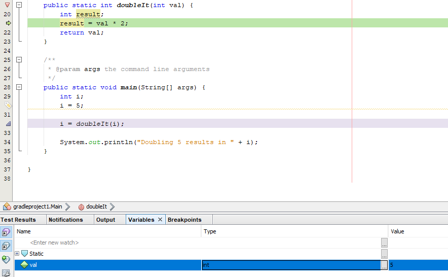 Notice the program pauses at the doubleIt method, and highlights in green the first statement of the program (at least the first statement in that menu that updates a value). The bottom window pane lists the variables in your program. The line highlighted in green hasn’t executed yet, it’s the position in the program indicating the next line to execute. So, for now we only see the val variable (the function parameter to doubleIt) in this pane. It correctly indicates the value 5, which it received from main.