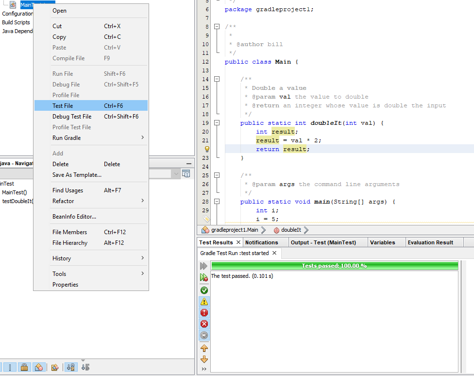 Right-clicking on the test class file and clicking Test File will cause the test methods inside to execute. Notice that our test method is annotated with @Test. You could create more of these by adding additional methods. Our test case is testing the value 6, which fails. Notice that the method returns 6 instead of 12, which is consistent with what we saw in our print statement earlier (but still incorrect).