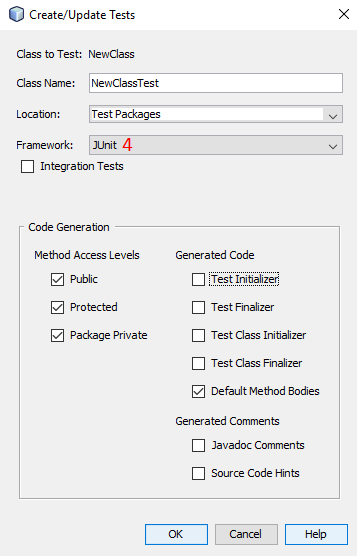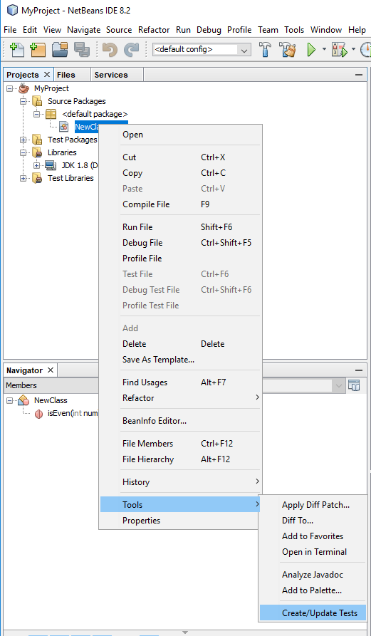 Let’s say we want to test the code method we provided in the introduction article with JUnit. You can follow the instructions in that article to create the sample project in NetBeans. Then, right click on the class file, then choose Tools -> Create/Update tests on the primary class of that project.
